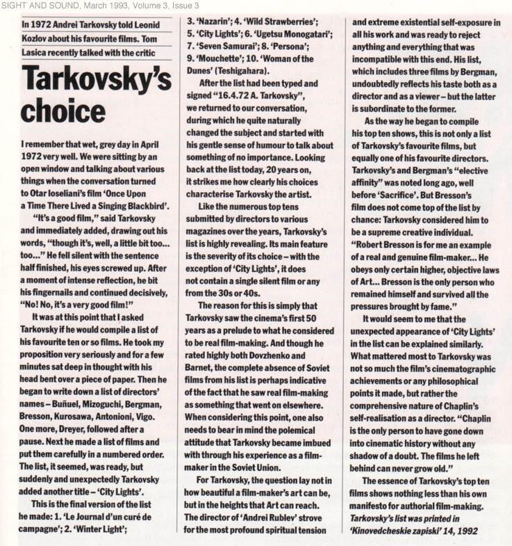 Em 1972, o realizador russo disse a Leonid Kozlov quais eram os seus filmes favoritos. O artigo e a lista foram publicados por Tom Lasica para a revista Sight and Sound de Março de 1993.